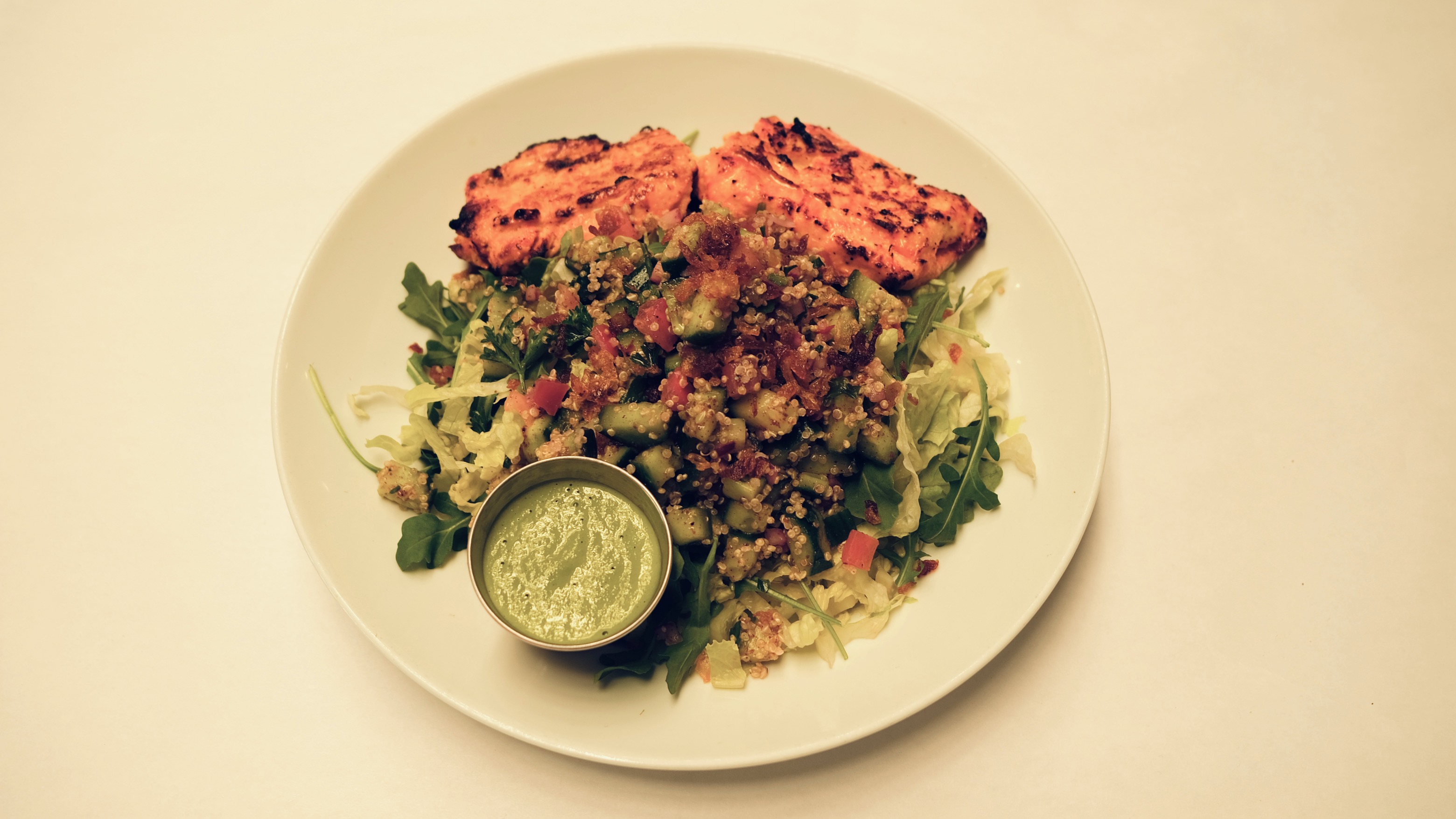 $26.50Our Famous Juicy Chicken over Chopped Romaine Lettuce, Cucumber, Tomato, Onion, Arugula, with creamy Pesto Dressing, and topped with Fried Onion.